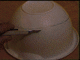 Now we'll take a knife and cut the bowl at the line we just drew. This should give us an accurate concave shape to fill the hole in the dome.