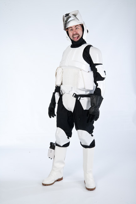 Nate and a friend took it upon themselves to hand form flat plastic sheets into a scout trooper costume. WOW, what a spectacular job!!!! Studio Creations takes their helmets off to you guys! |