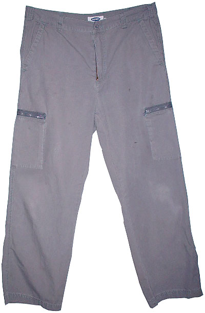 The pants were plain swat-grey colored pants with cargo pockets sewn onto the outside thigh area. Try to find cargo pants or military BDU pants that look similar and modify the side pockets. You might want to buy two pairs of pants, cannibalizing the second pair for cloth that will make the proper sized thigh pockets.