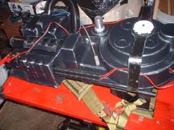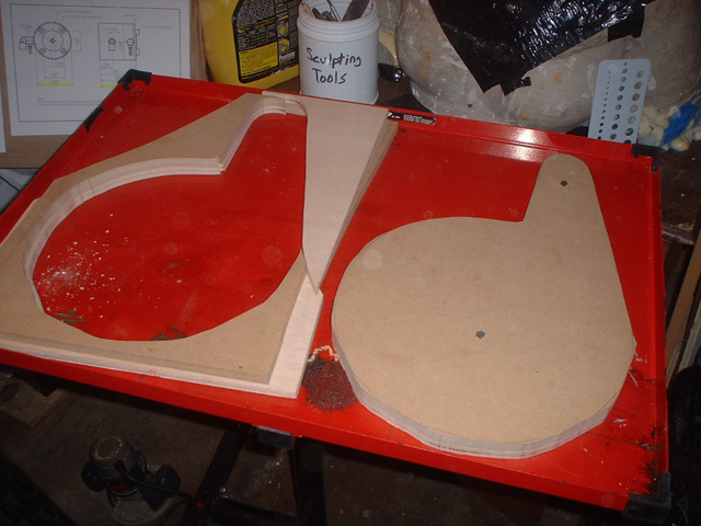 12.15 am Using a bandsaw (or a jigsaw), I cut out the shape of the Cyclotron. The screws keep the two sheets of plywood together and that ensures matching cuts. 1:25 am I now separate the two pieces of plywood and slip blocks of 2x4 wood in between them. I make sure the plywood plates line up vertically and screw the plates to the 2x4 spacers. 3:59 am I cut a 48 inch strip of sheet metal with tin snips and walled the cyclotron with it. The bottom curve of the cyclotron is faceted and I bent the facets into the wall a vise, prior to attaching to the cyclotron. I screwed the sheet metal wall to the plywood in various places. This wall took 2.5 hours to fabricate. 4:27 am I place and screw the cyclotron to the master plywood base of the proton pack via the bottom side of the master base. Sleep/Lunch 3:24 pm I used a metal "baking pan" for the raised circular part of the cyclotron. The 4 donut looking detail pieces are the parts of wire spindles, epoxied into place (a year later I replaced these with circles cut from 1/8 inch thick wood using a drill mounted hole-saw). The "cyclotron filter" is made from the bottom part of a blue plastic drinking mug, also epoxied into place. 9:47 pm I trim the master base of the proton pack with a bandsaw. and prepare the mold for the vaccuumtable. Coating the porous wood with a mold release is crucial for getting the plastic off the mold once vacuumformed. Mold release notes: Vaseline or petroleum jelly works in a pinch, but clean-up is laborious later on. Stoner makes a nice dry-film mold release called E455 Thermoset Mold Release, which is what we use. 2 hour Dinner break The first vacuumforming does not suck down too well. The second vacuumforming is better. The Cyclotron gains good detail and the edges are crisp. The top of the proton pack is a little soft in detail, but it will work for our needs. 1:50 am I trim with a knife/blade the excess plastic off of the vacuumformed plastic, leaving what will be the main body of the proton pack. I also cut the master "mother board" which will make the back side of the proton pack. 3:28 pm I start attaching the hoses and cables that will detail the final pack. I should have 'dry brush' painted the "distressing and weathering" onto the proton pack prior to this stage, but forgot to and had to paint that detailing on after the cables were attached. 4:39 am Here you can see the military "alice pack" and the cyclotron bumper attached to the proton pack. "Distressing and Weathering" paint is applied. I attached the alice pack to the 1/4 inch wood "mother board" plate. At this point I remembered I had to attach the proton pack energy cable to the mother board too, for the stress of the cable being pulled and twisted while being used would be too much for the thin vacuumformed shell to hold up to by itself. Notice the tall wooden blocks screwed to the mother board also. These are what the vacuumformed shell screws to, keeping the plastic shell secure on the motherboard. 5:00 am
