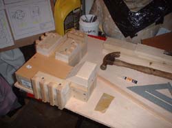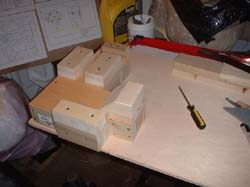 5:07pm The GB proton pack is mainly made up of a series of boxes that are painted black and have electronic wiring attached to them. I decided to make my boxes out vacuumformed plastic, keeping the final proton pack light weight, but, I needed to make my vacuumform plugs (molds) out of wood. In the image above you can see my initial layout for the boxes that make up the upper part of the proton pack. I am comparing the box layout to the 1:1 blueprint. 6:55 pm Once I am happy with the layout, I secured the wood walls to a master plywood base (from the bottom of the plywood of course). 7:31 pm I screw a 1/8th inch wooden top to the wooden walls, then router the top smooth. 9:50 pm Next I make variable height tops for the final box shapes. Basically these are fabricated from 3/4 inch wood boards and screwed into place. A 2x4 baord, cut diagonally on the bandsaw, is used for the slanted 'booster pipe' tower. 10:43 pm I added/glued 1/4 inch wooden edge trim to the sides of the boxes for detailing. 11:11 pm Detail closeup. Notice the wooden piece inbetween the two boxes. I custom cut this from a 2x4 and shaped the curved top with a power sander. 12:02 am